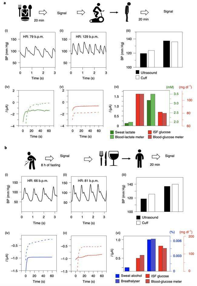 为了研究这些影响,几名志愿者被要求在固定水平上进行 30 分钟的脚踏车运动,然后休息 5 分钟。在运动前后刺激出汗时记录血压以测量乳酸,并使用商用袖带式血压计和血乳酸计验证获得的血压和乳酸水平数据,从该装置收集的血压和汗液乳酸数据与其他成熟验证方法和商业设备的检测结果一致。