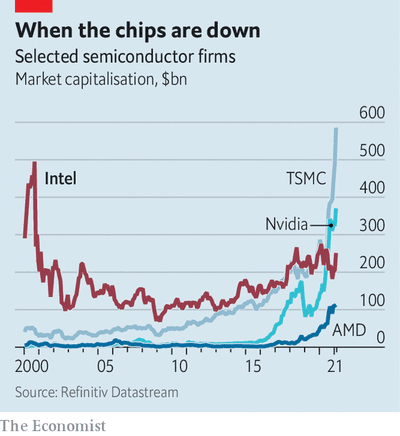 然而,英特尔的股价却落后于竞争对手。Nvidia是一家拥有英特尔收入七分之一的公司,其市值达到3700亿美元,再次高出一半(见图)。依靠英特尔成功的大部分制造技术都落后了。它错过了智能手机的革命。它的一些大客户,例如苹果和亚马逊,正在变成竞争对手。然后,Gelsinger先生继承了这个托盘。