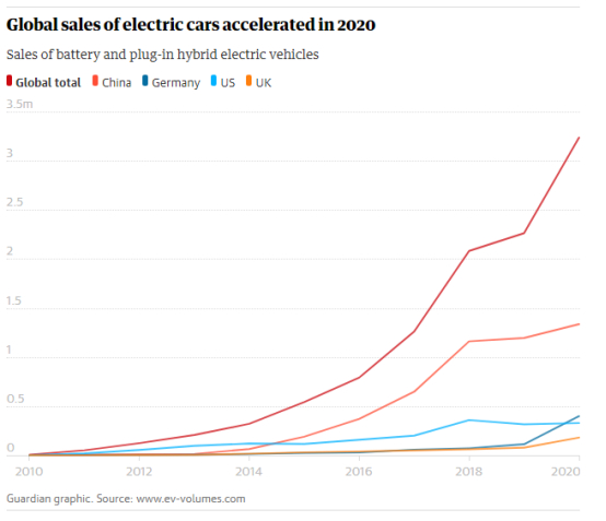 2010至2020年全球电动车销量走势(图片来源:theguardian.com)