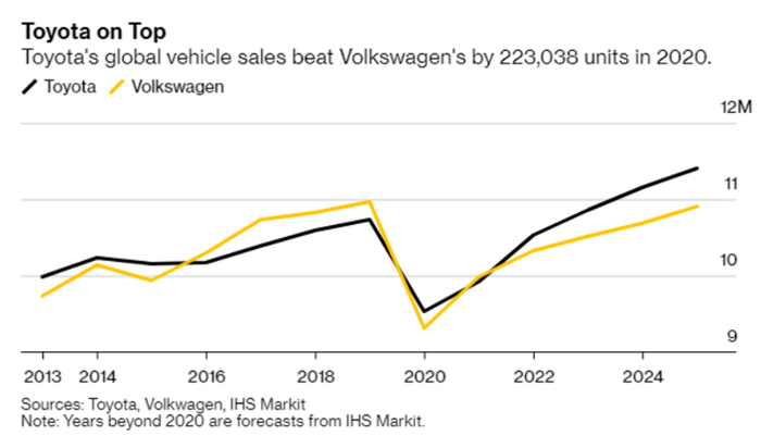 2013至2020年大众和丰田销量走势,2020年以后为IHS Markit预测数据(图片来源:彭博社)
