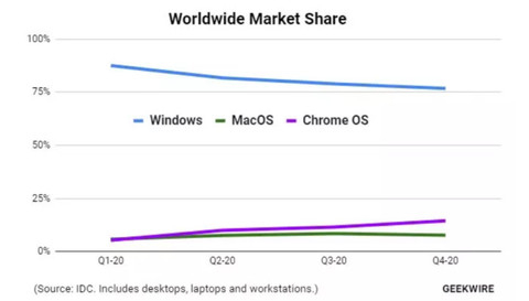 根据IDC的数据,Chromebook笔记本电脑的全球市场份额首次超过了 Mac 电脑。