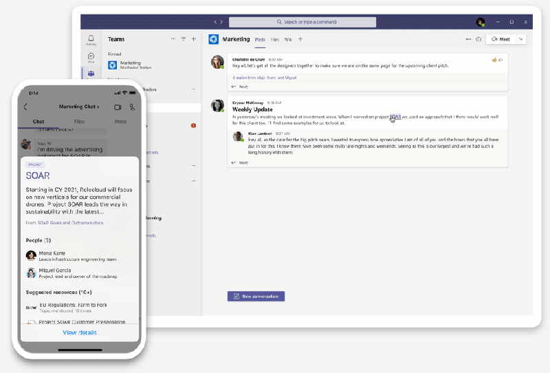 Viva Connections是Viva Topics的补充,它将消息、对话、其他设备和应用程序(如Microsoft Teams)中的资源整合在一起,提供个性化的信息流。员工可以用它探索新闻,并参与内部对话。