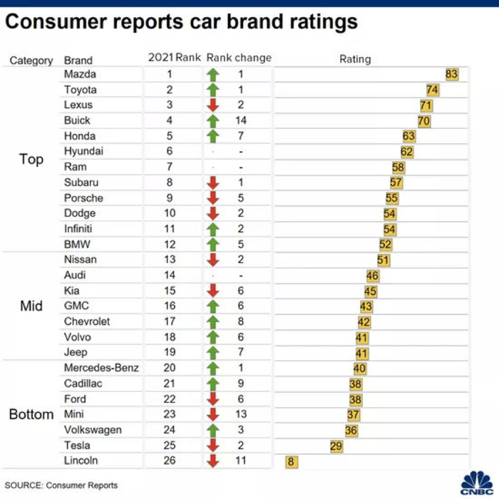 相比J.D.Power,《消费者报告》是一家更权威的独立非盈利组织。其最新的汽车品牌排名榜单,以道路测试、质量可靠性数据、车主满意度调查和安全性能四项内容为基础,榜单是《消费者报告》基于36.9万名车主提供的数据,然后根据各品牌报告的问题数量和其他衡量指标分析,来整理最终排名,所以参考价值也非常大。