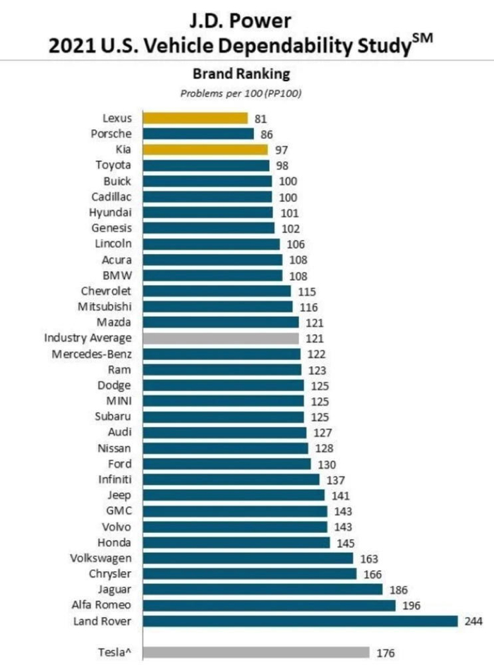 首先是J.D.Power发布了2021年度的汽车可靠性研究排行榜,这份榜单以购买车辆3年的8000位顾客为研究对象,涵盖32个品牌(主流品牌18个、豪华品牌14个)的153款车型,共计33,254辆汽车。
