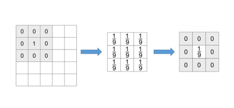 例如,你想对图中的左上角九宫格的中心方块进行平均操作(图中颜色仅起强调作用,和数值无关),将它的颜色和周围方块的颜色进行一个平均,那么你可以使用一个预先定义的模块,这个模块在计算机领域被叫做滤波器(或者卷积核,此处不做过多区分)。你可以想象它是冒险小虎队的解密卡。我们通过将滤波器放置在原图片上,将每个原图片中的对应像素,与滤波器里对应小方块的数值进行乘法运算,最后加起来,成为新图片里,中心像素的值。例如在下面的图片中,我们展示了其中的一步操作,把左上角的方块和滤波器的对应方块进行乘法运算,然后再加起来,最后,得到中心像素的值是 8*0*(1/9) +1*(1/9) = 1/9。