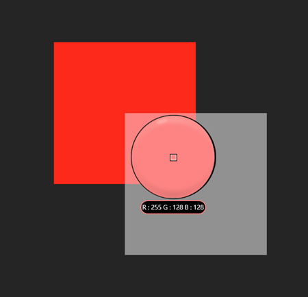 与其瞎猜,不如动手试一试。先画一个纯红的方块 RGB = (255,0,0),再在上面叠加一个 50% 不透明度(即 Alpha = 0.5),纯白的方块 RGB = (255,255,255)。最后,用取色器看看重叠的部分到底是什么颜色,发现就是两种颜色简单地进行了平均 RGB = (255,128,128) = Alpha * (255,0,0) + (1-Alpha) * (255,255,255)。