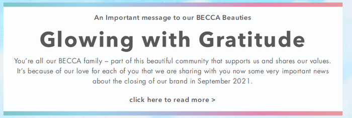 可惜,“时代的一粒灰尘,落在个人头上,就是一座山”,这句话如今也可以用来形容被时代和疫情击垮的BECCA。BECCA在一则通知中写道,“市场挑战的累积以及新冠疫情的全球影响已经超出了我们的承受范围,我们不得不在2021年9月底做出令人心碎的决定,关闭BECCA品牌。”
