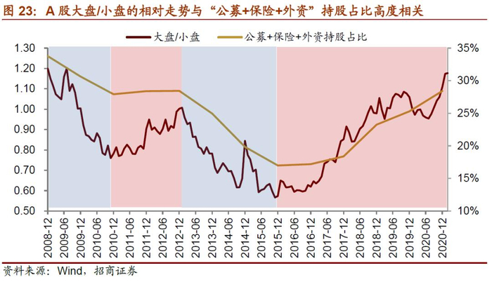 从A股市场来看,“公募基金+保险+外资”等机构投资者在A股的占比与大小盘相对走势相关性较高,该比例提升时,大盘股占优;而该比例下降时,小盘相对占优。2016年以来,该比例持续提升,大盘股也在过去5年相对持续跑赢小盘股。