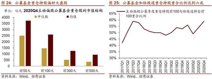 究其原因,以公募基金、保险、北上资金为代表的专业机构类投资者更偏好大盘股,在这些机构占比提升的阶段大盘股占优。以公募基金持仓为例,2020年四季报主动偏股公募基金的重仓持股中,前50大重仓股、前100大重仓股、前300大重仓股等不同组别的股票市值依次下降,可见持仓占比越高的股票其市值越高,意味着公募基金总体更偏好大市值的龙头股。此外,陆股通前100大重仓持股与公募基金重仓股重合度高,达到六成,共同强化了2016年以来A股的大盘风格。