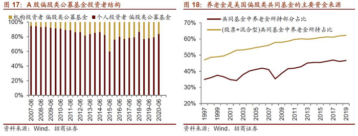 美国市场上,养老金则是偏股类共同基金的重要资金来源。偏股类共同基金中,养老金所持部分的占比持续攀升,截至2019年末已经达到62.3%。
