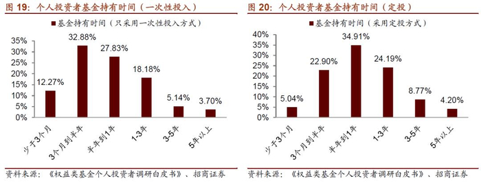 对比来看,虽然同样是居民资金投资共同基金,但是国内居民资金基本直接购买基金,而美国市场上,更多居民资金则是通过养老金计划间接持有共同基金。2019年的一份基金个人投资者调查报告《权益类基金个人投资者调研白皮书》显示,六成以上的个人投资者持有基金的时间在1年以内(一次性投入方式为73%,定投方式为62.85%),能够持有3年以上的占比仅一成(一次性投入方式为8.84%,定投方式为12.97%)。整体来看,A股权益类基金的个人投资者持有基金的周期比较短,造成这一现象的原因主要包括居民承受风险的能力较低、对投资收益的预期低、频繁地关注基金业绩等,这些都导致居民对于短期的市场波动比较敏感,甚至作出基金赎回的决策,当基金被大额集中赎回的时候,基金重仓股承压。