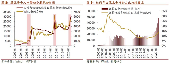 另外,2017年以来公募基金持股规模在A股自由流通市值占比持续提高,尤其在2019年和2020年,在大量居民资金通过基金入市的热潮下,公募基金规模稳步扩张,进一步带动了公募基金在全市场持股比例的提升。