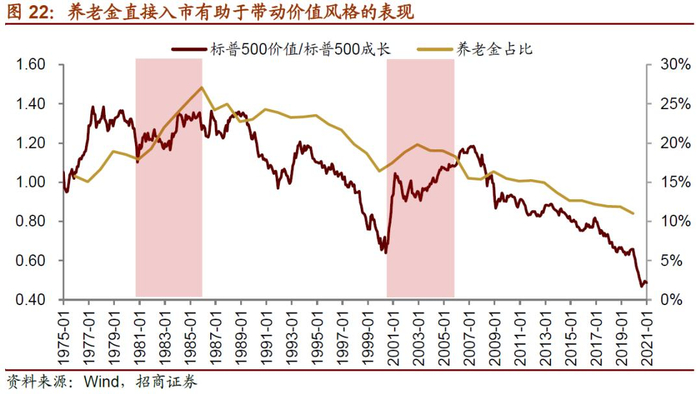 从美股的成长价值风格来看,养老金直接入市有助于价值风格的表现。上世纪80年代美国养老金规模快速扩张且对股票的配比有明显的提升,在此期间标普500价值总体略跑赢标普500成长指数,价值风格占优。另外,2000年互联网泡沫破灭,成长风格遭到重创,2002-2007年,美国养老金规模出现一轮加速扩张,且养老金对股票的配置比例阶段性提升,带动养老金在美股的市值占比回升。而养老金属于相对稳健型投资者,投资风格偏价值,进一步强化了在此期间美股价值风格的表现。不过总的来看,美股结构化过程中成长风格在更长时间和更大幅度上跑赢了价值风格。