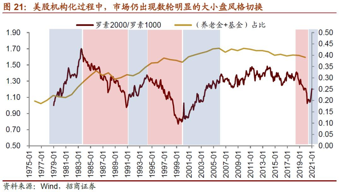 从美股市场的大小盘风格来看,在机构持股占比扩张的过程中,市场仍出现了数轮明显的大小盘风格切换,大盘股并不总是跑赢。上世纪70年代到2007年期间,以养老金和基金为代表的机构投资者持股占比快速提升,以罗素2000指数与罗素1000指数的比值衡量小盘与大盘风格的相对强弱,1979年以来,美股共出现三次小盘占优、三次大盘占优,并且去年年末以来美股小盘股再度跑赢。但如果拉长时间来看,在上世纪80年代到上世纪末养老金和基金占比扩张最快的这个区间,美股的大盘股总体明显跑赢小盘股。