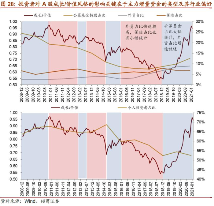 (4)A股市场的成长价值风格与机构占比的高低并无直接关系,关键在于不同阶段主力增量资金的类型及资金的行业偏好。