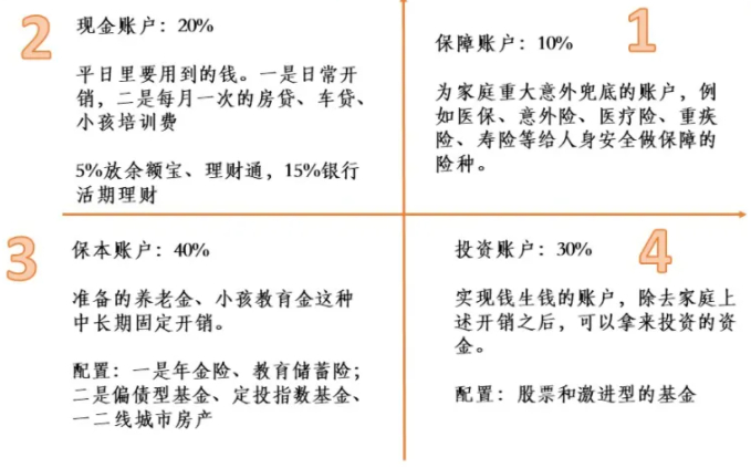 2) 不管家底怎样,一定要做好配置。现金账户、保本账户、投资账户、保险账户合理规划,一个都不能落下。