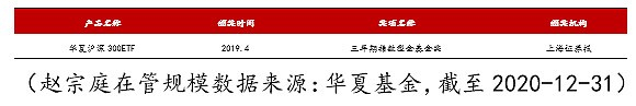 赵宗庭先生2016年11月加入华夏基金管理有限公司,2017年4月起开始担任华夏沪深300ETF等产品基金经理,曾任研究发展部产品经理、数量投资部研究员等,现任数量投资部高级副总裁,担任华夏沪深300ETF、华夏芯片ETF、华夏上证主要消费ETF、华夏纳斯达克100ETF基金经理等职务,具备丰富的权益类ETF管理经验,截至去年末在管公募基金规模726.65亿元。