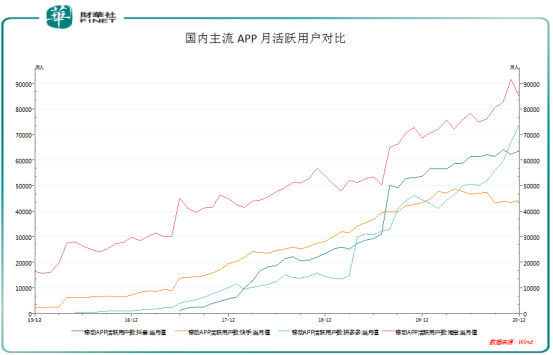 直到2020年,拼多多月活才勉强压住抖音一头。根据Wind数据,2020年12月,抖音APP月活约6.36亿,拼多多APP月活约7.41亿,领先抖音约1亿。