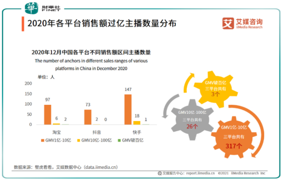 根据艾媒咨询数据,截止2020年12月,共有346名主播年带货在1亿元以上。其中,在「1亿-10亿元」区间里,快手主播有147人,淘宝主播97人,抖音主播73人。