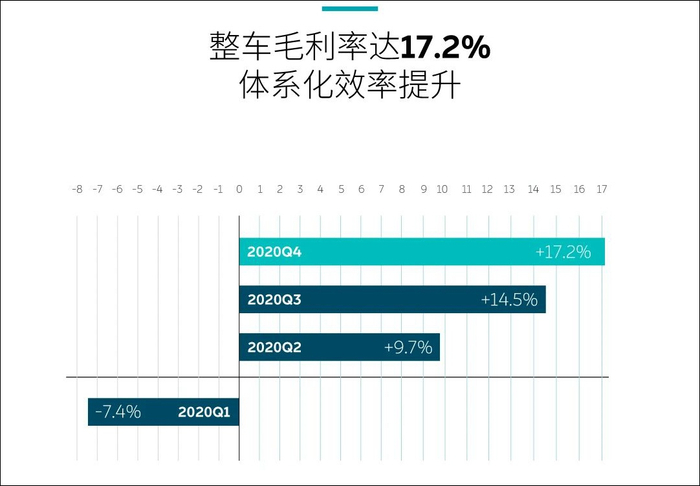 同时,蔚来2020年销售毛利率为12.7%,较2019年的-9.9%有了大幅提升。其中在第四季度,蔚来汽车利润率为17.2%,而2019年第四季度和2020年第三季度分别为-6.0%和14.5%。蔚来表示,汽车毛利率的增长是由于去年第四季度车辆交货量的增加,以及部分零部件采购价格的下降共同推动的。