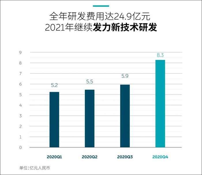 车型技术研发方面,蔚来2020年的研发费用为24.88亿元,比上年下降43.8%,占全年营收的约15%。其中第四季度研发费用为8.294亿元,同比下降19.2%。蔚来表示,研发费用减少的主要原因是公司整体节约成本和研发职能运作效率提高,使得设计开发成本和员工薪酬减少。