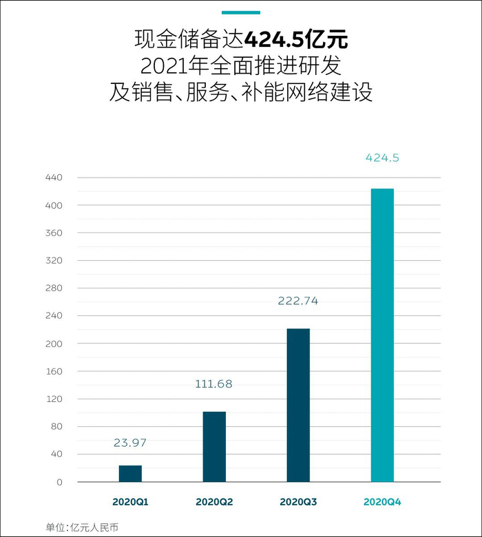 截至2020年12月31日,蔚来现金及现金等价物、限制性现金和短期投资余额为425亿元。