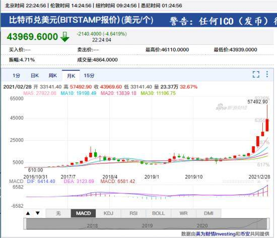 但没有任何信用背书,加密货币的价格波动极大。2月23日到2月28日,比特币便经历了从57492美元到44000美元的来回暴涨暴跌,惊心动魄程度不亚于坐高速过山车。