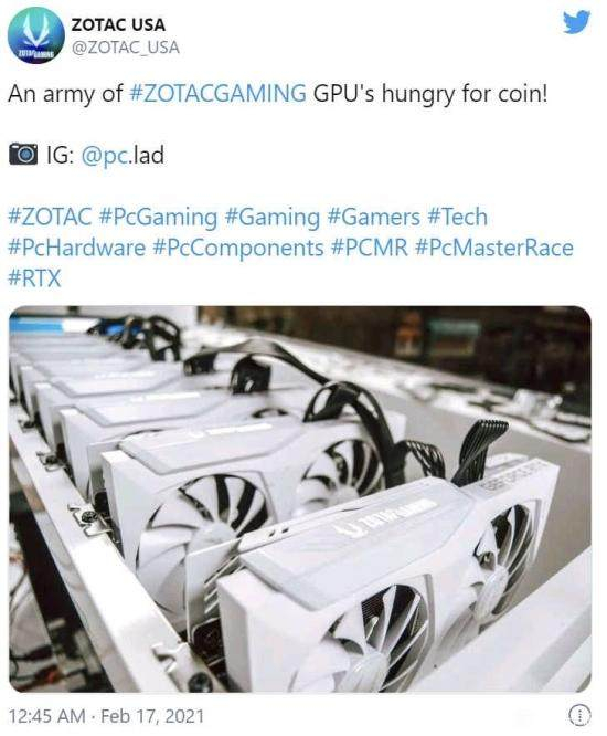一线显卡品牌商索泰,在其官方推特上贴出一张整齐排列的插满索泰显卡的矿机。此举惹怒了一众玩家,索泰不得不删掉此推特以平息怒火。