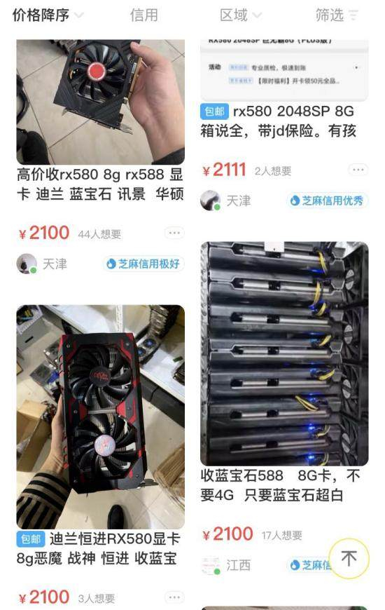 二手显卡也没能逃过一劫,在闲鱼等二手平台上,显存大于4GB,适合挖矿的显卡早被黄牛和矿商一扫而空。