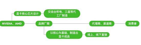 显卡的制造商,目前只有英伟达(NVIDIA)和超威半导体(AMD)两家,除了少量直销的公版显卡外,绝大部分的显卡生产与销售流程如下图所示。