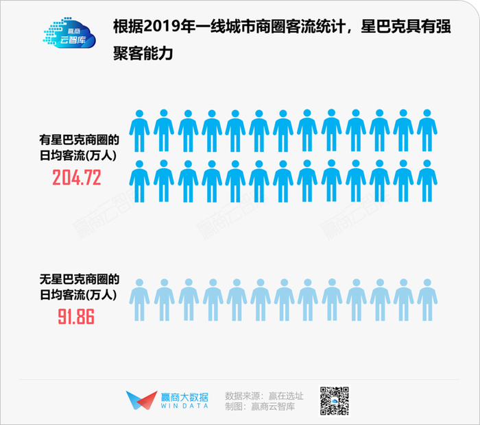 据赢在选址统计,截至2019年12月,星巴克高线城市(以新一线城市研究所划分标准算,包括一线、新一线及二线城市)门店存量高达95%。其中,有星巴克开店的商圈日均客流比无星巴克商圈高两倍以上。