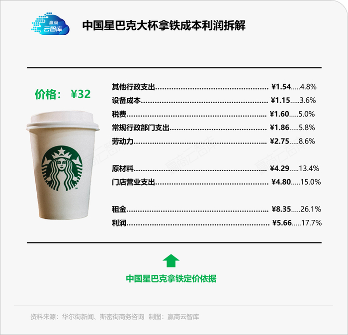 根据华尔街日报及斯密街商务咨询的调查,中国星巴克售卖的大杯拿铁定价32元人民币,其中利润占比高达17.7%,处于同行业的高水平。