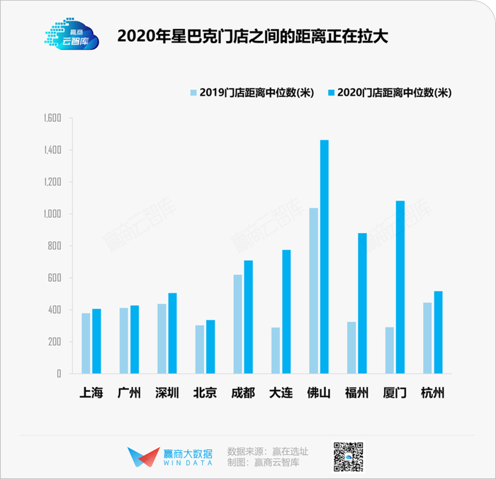 基于此,赢在选址统计了2019年、2020年星巴克在10个高线城市门店数据,以量化方式计算了各城市间门店距离中位数,发现:10城门店距离中位数都有上升,特别是新一线、二线城市升幅明显。