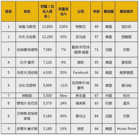 埃隆·马斯克凭借特斯拉疯狂上涨的股价登顶世界首富;亚马逊创始人杰夫·贝佐斯位居第二;“奢侈品之王”酩悦·轩尼诗-路易·威登集团(LVMH)董事长伯纳德·阿诺特排名第三;比尔·盖茨退居第四。“瓶装水之王”钟睒睒凭借农夫山泉上市,成为中国首富,排名全球第七。
