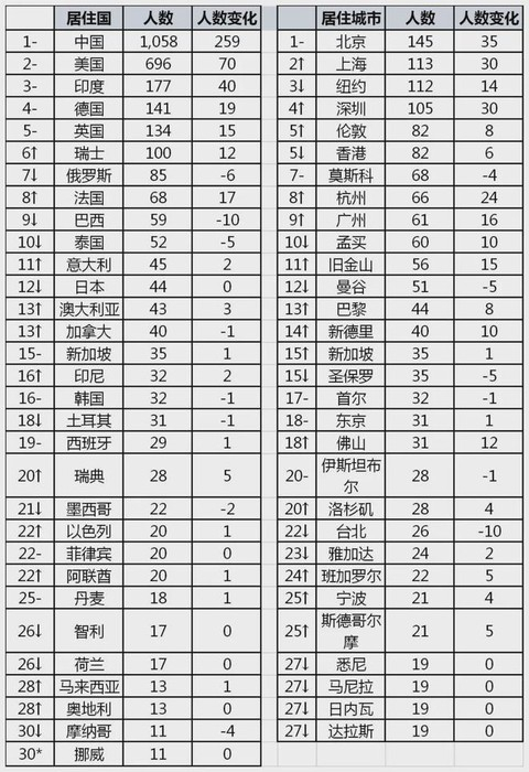 上榜富豪国家分布 上榜富豪城市分布