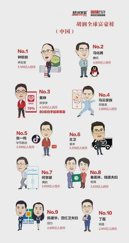 除了钟睒睒,中国另两位顶级富豪马化腾和黄峥也跻身世界顶级富豪榜前20。“Pony马”马化腾财富过去一年大增70%,排名上升8位,位列第14位;拼多多黄峥财富更是暴增283%,排名上升41位,位居第19位,并超越马云家族。