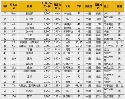 而美团的王兴财富增长高达347%,成为中国前20大富豪中财富增长最快的企业家。宁德时代的曾毓敏、海天味业的庞康则凭借去年股价飙升双双跻身全球前50。