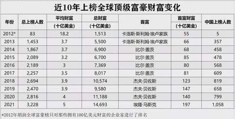 3月2日,胡润研究院发布《2021胡润全球富豪榜》,全球新增412位顶级富豪,共有来自68个国家2402家公司的3228位十亿美元企业家上榜,创历史新高。
