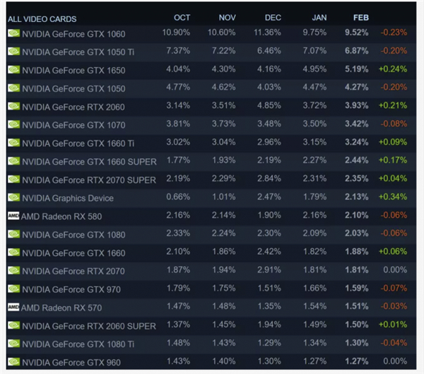另外,榜单中爬升幅度最大的两款产品分别是第三名的GTX 1650和第五名的RTX 2060。