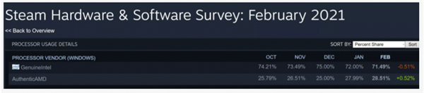 这种下滑在12月的Steam调查中得到了反映,当时AMD出现了多年来的首次下滑。此后恢复了正常,该公司处理器份额上个月上涨0.52%之后,现在占据了28.51%的份额。