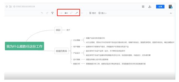 2、进入在线思维导图绘制界面后,在顶部工具栏可以插入不同层级的主题、添加关联线等操作。