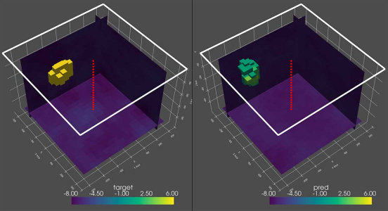 ▲AI可视化描绘了井眼电磁模型的预测图,左图为真实值,右图为预测值(来源:KoBold Metals)