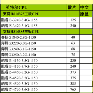 所以我今天特意曝光市面上电脑CPU的品牌、型号、技术参数和进货价格供大家参考,了解电脑CPU的进货低价后就不会再被不怀好意的店家坑到,想必大家也不了解散片CPU和原盒CPU的区别吧?原盒CPU就是全新未拆封,厂家承担三年的质保期。散片CPU说白了就是二手货,一般都是店面承担1年的质保期。原盒CPU和散片CPU的性能基本上都一样,CPU的保值率非常高,也不用担心有假货,因为CPU的制造工艺十分繁琐,制造技术要求十分高,我干电脑行业有十几年了,至今没有发现一例假CPU,大家记住:CPU只有新旧之分而没有真假之分。