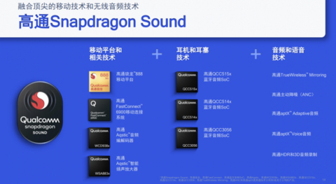 首先需要明确的是,Snapdragon Sound并不是仅针对某个单一音频链路进行优化的单项技术,它涵盖了包括移动平台和相关技术、信号处理和无线连接、音频和视频等技术组合。也就是说,这是高通现有的各种音频技术的打包方案,首次从系统层面解决无线音频的痛点。