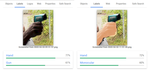 经非盈利研究和倡导组织 AIgorithmWatch 证实,谷歌旗下计算机服务 Google Vision Cloud 会将手持测温计的深肤色人员图像标记为“枪”,而相同条件下,浅肤色人员图像则被标记为“电子设备”。究其原因,这与深肤色的人员图像在数据训练时在暴力场景出现的高频率有关,随后谷歌致歉并更新了算法,测温计图像中不再出现“枪支”标记。这种对于有色人种在数据训练中的忽视,已经成为 AI 偏见常出现的情况。
