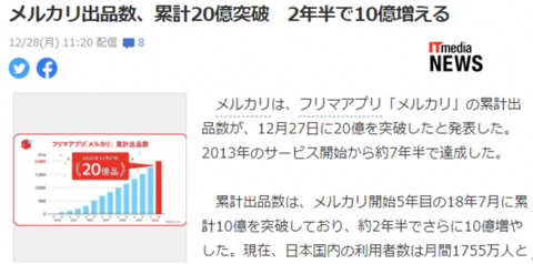 2020年12月最新数据显示,Mercari累计上架货品达到了20亿件,平台MAU达到1755万人,要知道日本总人口才约1.2亿。