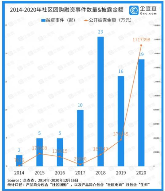 据企查查《2020年社区团购投融资数据报告》显示,2020年社区团购公开融资事件达19起,融资金额高达171.7亿元,同比增长356.3%,创下历史新高。