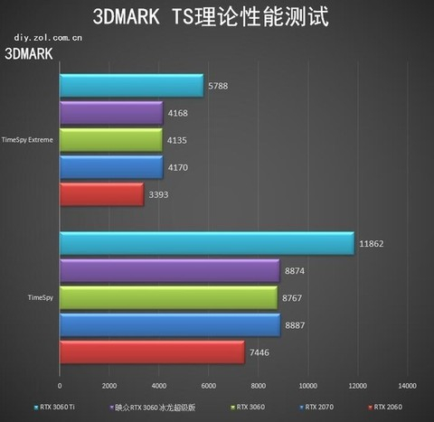 而在针对DX12环境下的Time Spy和Time Spy Extreme测试中,映众GeForce RTX 3060冰龙超级版的分数与RTX 2070进一步缩小,分数几乎持平。