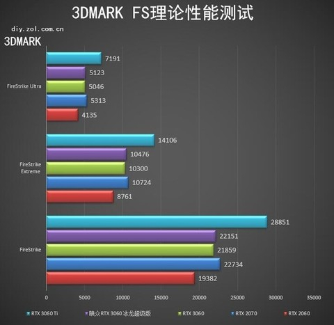 在针对显卡DX11性能的3DMARK FS套装测试中,我们可以看到映众GeForce RTX 3060冰龙超级版的性能与RTX 2070相差不大,整体约为2%,并且由于1837MHz高于公版的频率,分数也有小幅提升。不过因为采用GA106芯片,性能要比采用GA104芯片的RTX 3060 Ti相差较大。