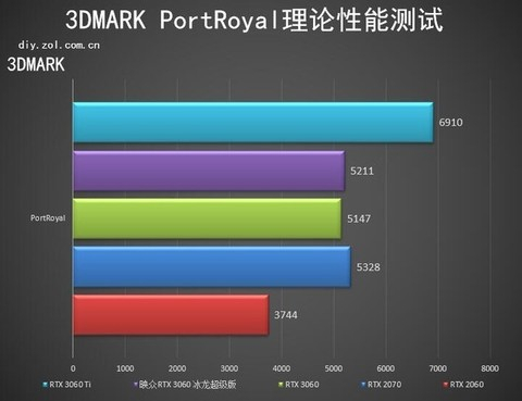 PortRoyal是3DMARK中专门针对光追性能的测试项,映众GeForce RTX 3060冰龙超级版的成绩相较RTX 2070的成绩低2%,同时要比RTX 3060 Ti的成绩低32%,不过相较RTX 2060的成绩提升更明显,达到39%。